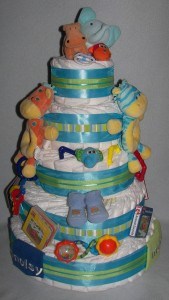 The non-parents in the crowd are probably wondering what in the world a diaper cake is. I know the first time I heard the term, I was mighty perplexed. A diaper cake is an awesome baby shower gift made from (usually) disposable diapers and made to look like a cake. Still wondering what it might look like? Check it out: