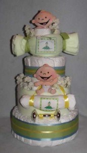 wow! Those are the nicest diaper cakes ever! I have learned the key to giving an exicitng baby shower gift is the presentation. Package your gifts in a creative way. I turned my sister’s gifts into a train for my nephew’s shower!