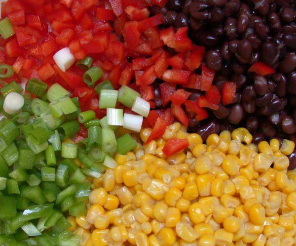 Open the can of beans and dump it into a colander. Rinse the beans thoroughly then drain well. Dump those into your serving bowl. Open and drain the corn and add it to the bowl.