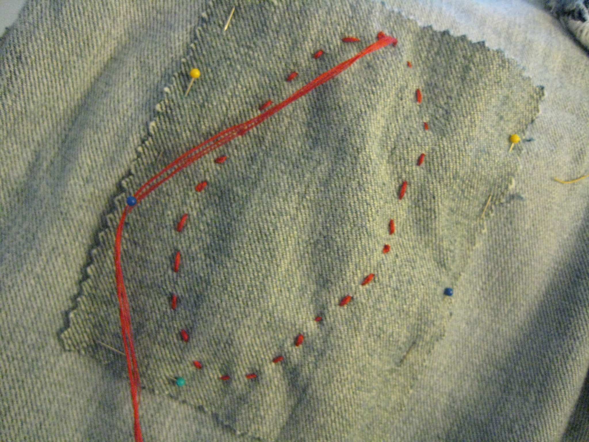 Step 2: Take the jeans you’re mending, turn them inside out, then lay them flat on a large, flat surface (may I recommend a clean floor?) Place the patch wrong side up over the hole on the jeans. Making sure neither the jeans nor patch are wrinkled, carefully place pins around the edges of the patch. Make sure you don’t poke your pin through both layers of the jeans! Being careful not to poke your fingers with the pins, turn the jeans right side out.