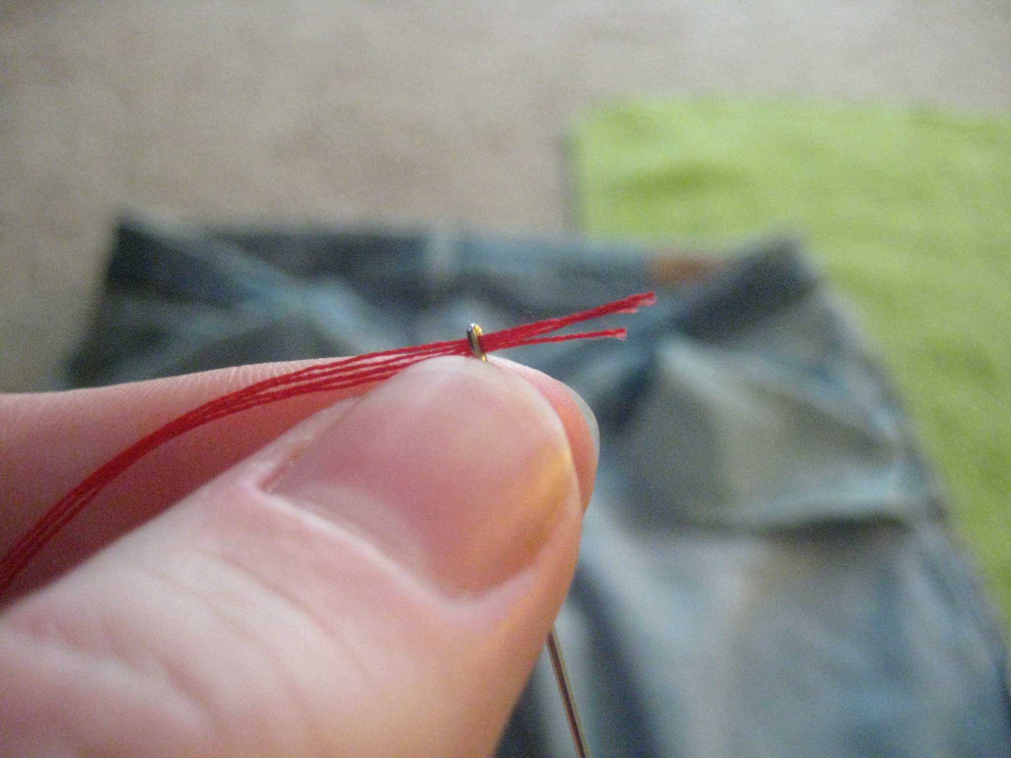 Step 3: To make your thread strong enough to patch jeans, measure out an arm’s length of thread four times over. Carefully line up all four ends of the threads and lick them before twisting the end of the threads together to make something like embroidery floss. Thread and knot your needle as you learned in steps 4, 5, and 6 the last sewing post. Once you’re done, you should have “thread” that’s eight strands thick. If you can’t manage to get all four threads into the eye of your needle, you can use three or two strands of thread, but please don’t use just one!