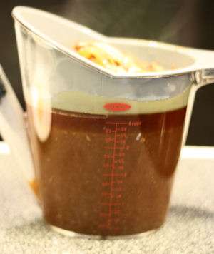 Pour all of the liquid into a fat separator or large measuring glass and remove the fat. Be sure to also separate the solid pieces (bacon, onions, bay leaves) from the liquid, too.