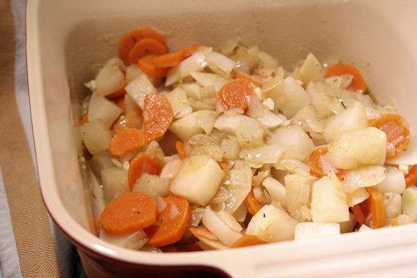 Add the onions, garlic, and thyme to the pan. Continue cooking over low heat until the onions are soft and translucent. Add the carrots and turnips to your pan, add the stock, and cover. Cook over low heat for 20 minutes or until the carrots and turnips are fork tender. Stir in the balsamic vinegar, salt and pepper to taste and toss to coat. (You don’t actually have to toss the food, a good stir will do.)